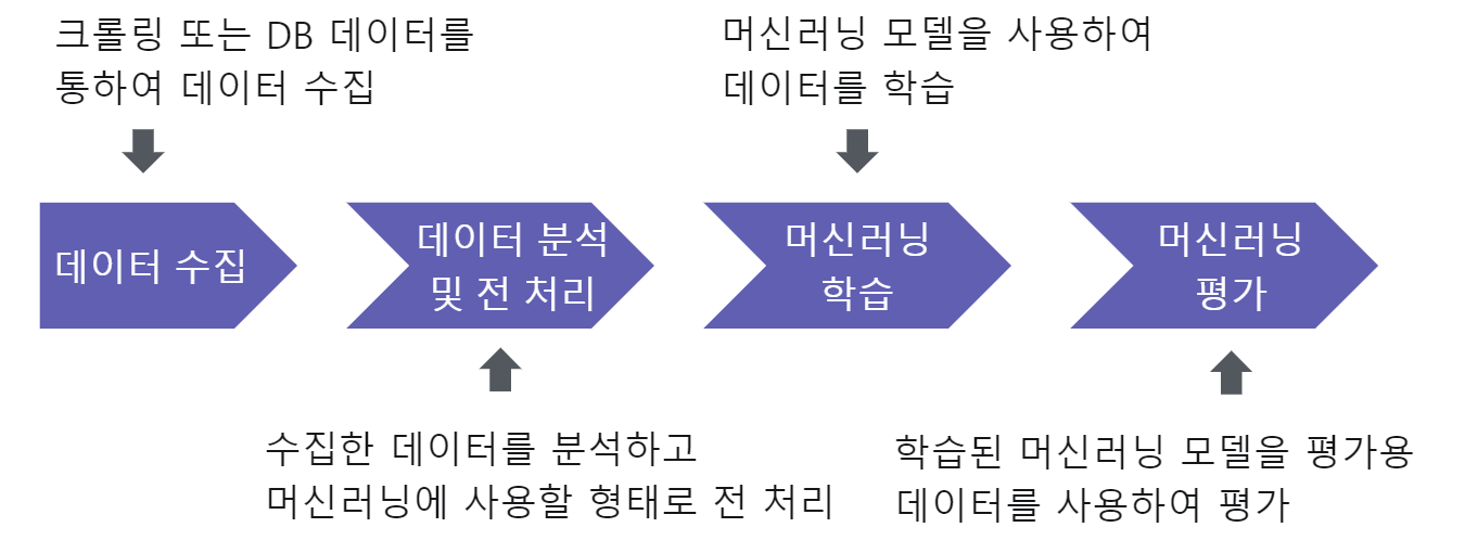 데이터 분석 및 전처리 단계 : 수집한 데이터를 분석하고 머신러닝에 사용할 형태로 변환시키는 단계
